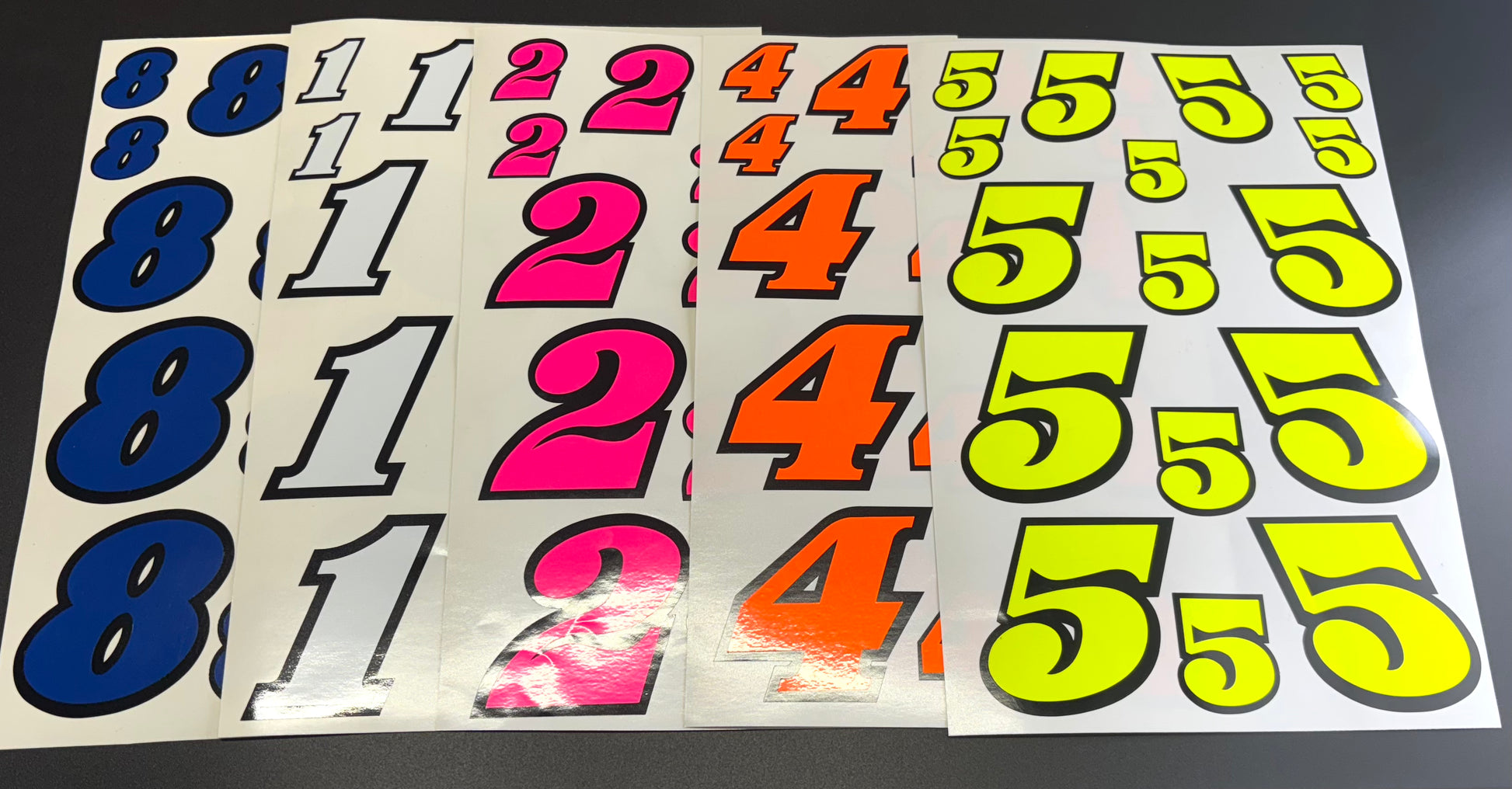 Choose your number and color option. Sheet Size 10.5” x 7”. Includes a set of 16 of the same number per sheet. Color options are Blue, White, Flo Yellow, Flo Orange, Flo Pink, all with Black borders.