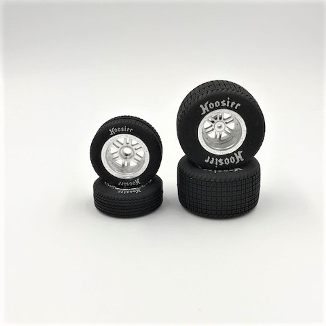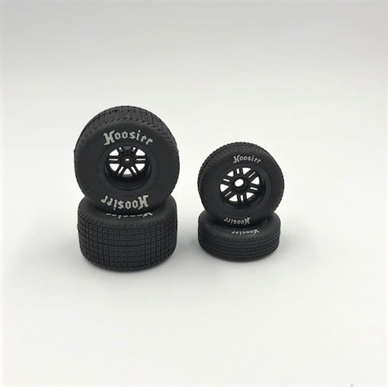 (2) Pre-mounted rear tires with Hoosier logo on black or chrome wheels