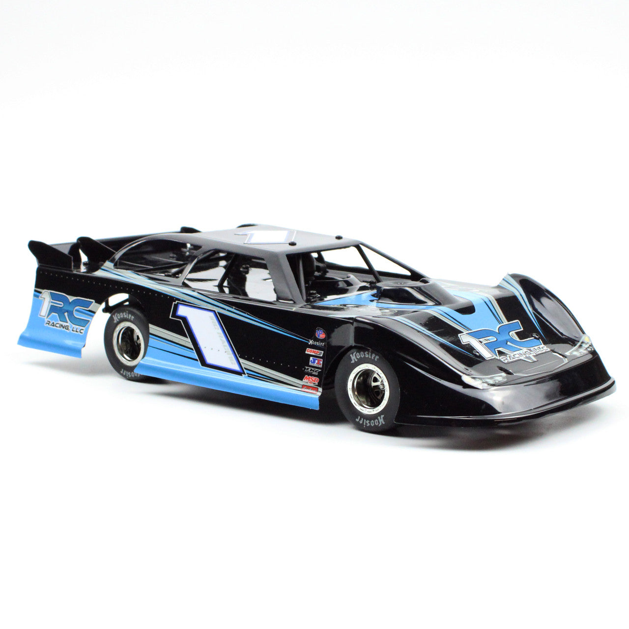The body is fully trimmed and ready to mount on your 1RC Racing Dirt Late Model.