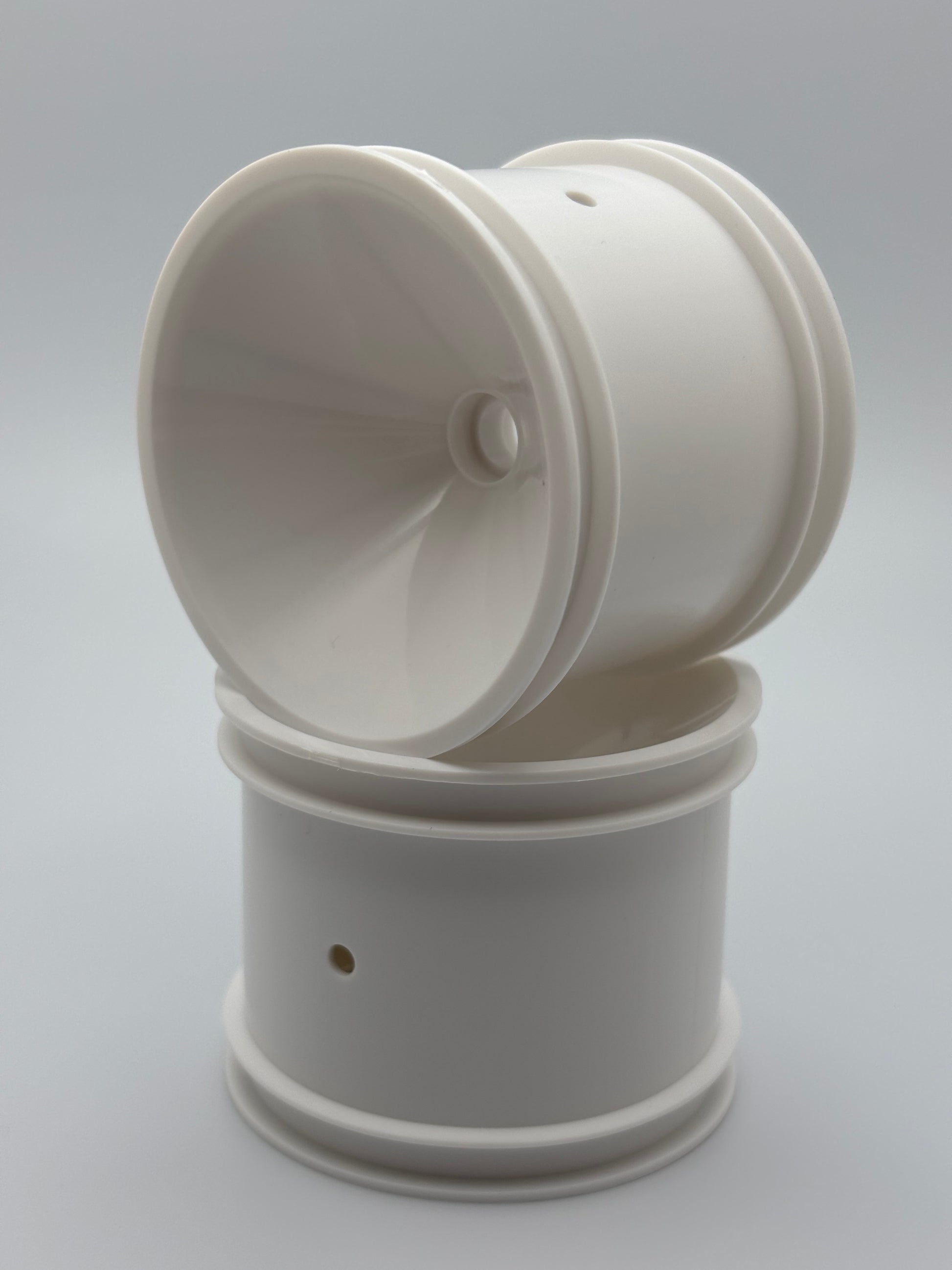 This is a replacement set of 2 front truck wheels that are white from Team Associated.