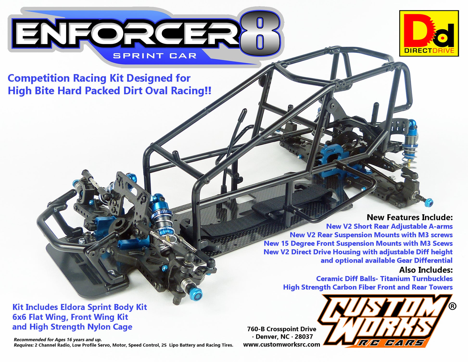 The next edition in the long line of Enforcer racing kits is now available from Custom Works. Featuring high quality precision cut Carbon Fiber and CNC machined Aluminum parts the Enfocer 8 is your best choice for high bite foam tire Sprint car classes on clay, carpet or asphalt. This all new direct drive version is perfect for stock or spec class racing where maximum drivetrain efficiency is needed. The V2 direct drive housings utilize our race proven lightweight ball differential and will also accept our optional new #4157 DD Gear Differential as well. New Diff supports allow for easy adjustment of diff height for wider tuning options.